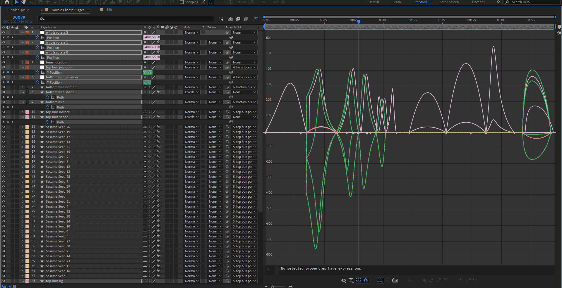1. In the first step of our Cheese Burger GIF, bread buns are made from a simple circle of bread. The shade (added with set matte effect), sesame seeds, and many more elements follow their parent with a little delay using valueAtTime expression in different timings as the following example: