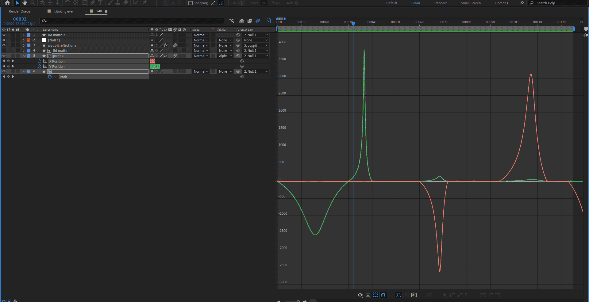 1. The eye opens from a single horizontal line, using shape path keyframes. As the eye opens, the pupil goes up and bounces back down to give its movement some weight to our Eye GIF Icon.