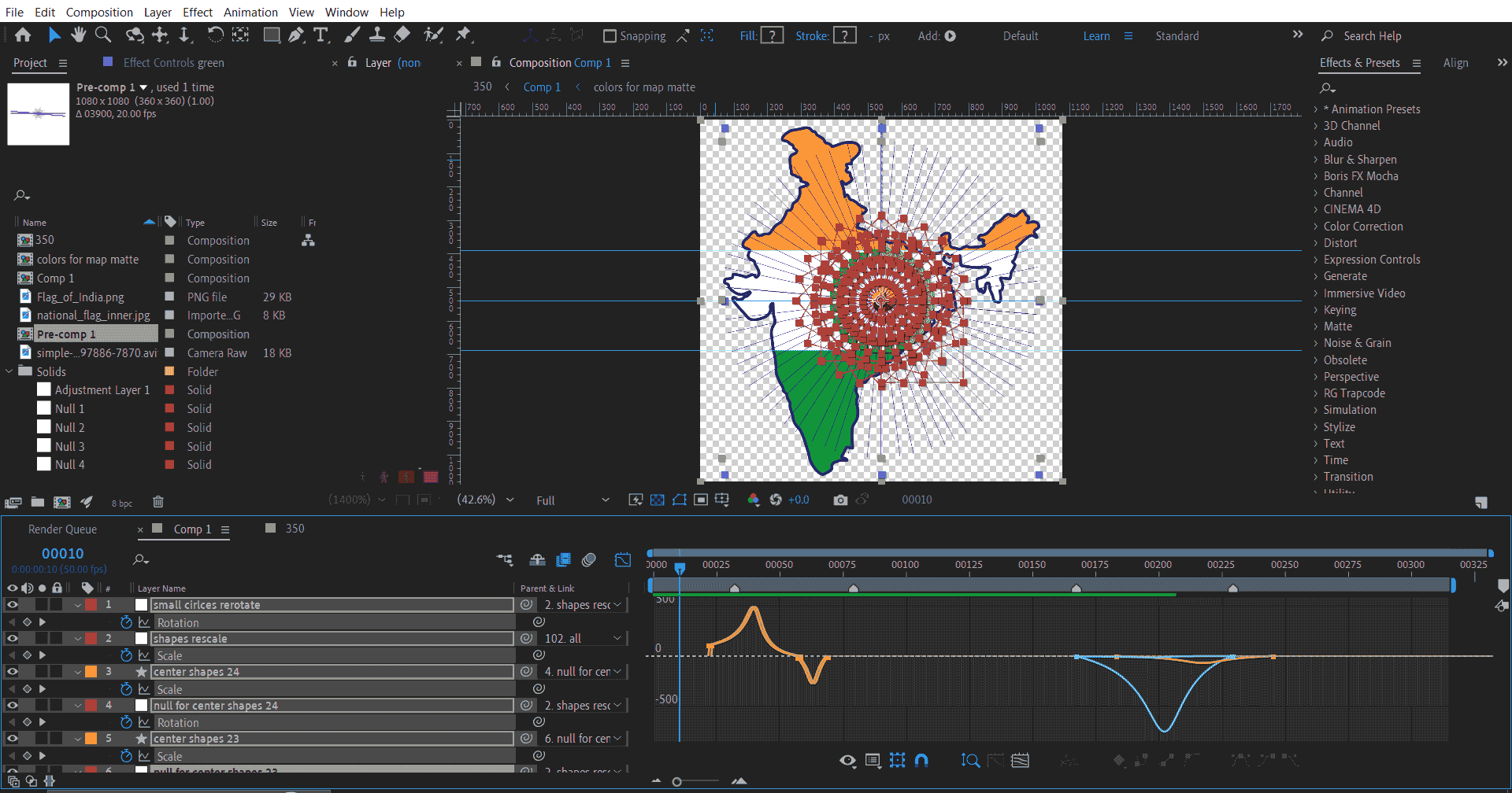 2. The Map of India starts to morph into a cicle which is the middle and main part the map of India. I used a system of 64 intersecting lines that meet in the middle of this circle. The reshape guide composition can be found in the flag of India and map of India free after effects project.