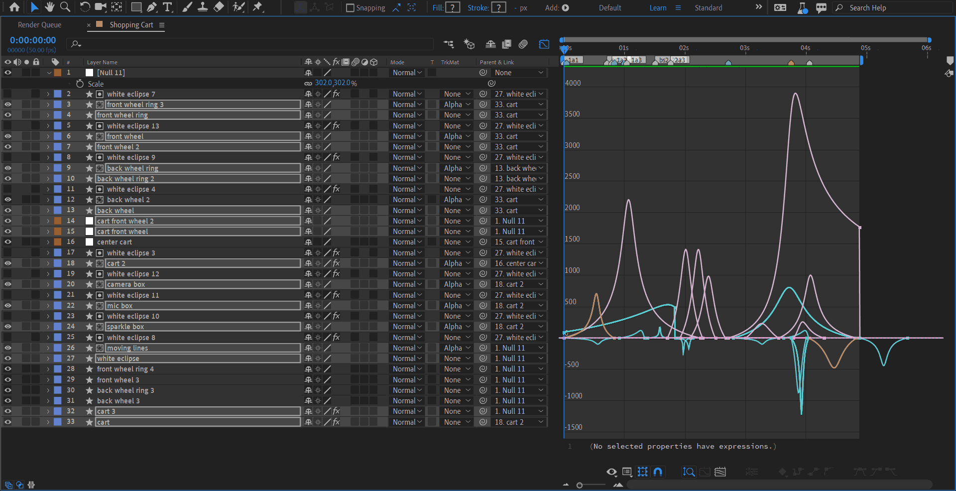 3. Then some horizontal lines go from right to left to replicate the feeling of moving on the ground. after moving for a while the shopping cart makes a sudden stop which makes it bounce forward on the anchor point of the front wheel center. these different anchor points on the same bath of shapes were possible through the use of null objects and parenting.